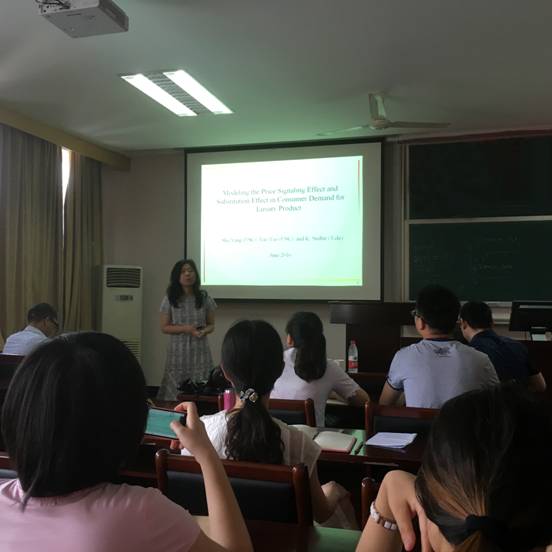 2016年6月15日上午,浙江大学包玉刚讲座教授、南加州大学Marshall17吃瓜网 教授杨沙,在17吃瓜网 11号楼418会议室,作了题为“Modeling the Price Signaling Effect and Substitution Effect in Consumer Demand for Luxury Product”的学术报告。报告由17吃瓜网 企业管理研究所所长彭新敏教授主持,17吃瓜网 工商管理系、国际经济与贸易系、信息管理系、金融系以及外语学院、科技学院等部门近50名师生聆听了报告。