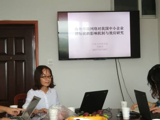 刘颖男老师主讲题目为“海外华商网络对我国中小企业国际化的影响机制与效应研究”。刘老师毕业于日本东北大学经济系,长期关注海外华商网络的发展动向。研讨会上,刘老师与到场师生分享了自己国家自科项目的研究背景、研究内容、研究方法、研究计划和目前的研究进展。点评专家提出要注意透过现象去挖掘深层次的问题,在科学层面提出一些新概念,并建议到温州、义乌等地找一批企业做访谈,提炼出一系列现实问题并展开深度分析。
