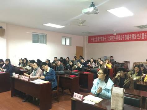 2017年12月29日,我院第十二届研究生委员会干部聘书颁发仪式暨年度总结大会在418会议室顺利召开。学工办主任董璐、团委书记陈彬、留学生辅导员毛跃祖、研究生辅导员陈文鹤以及全体研会成员出席了本次仪式。