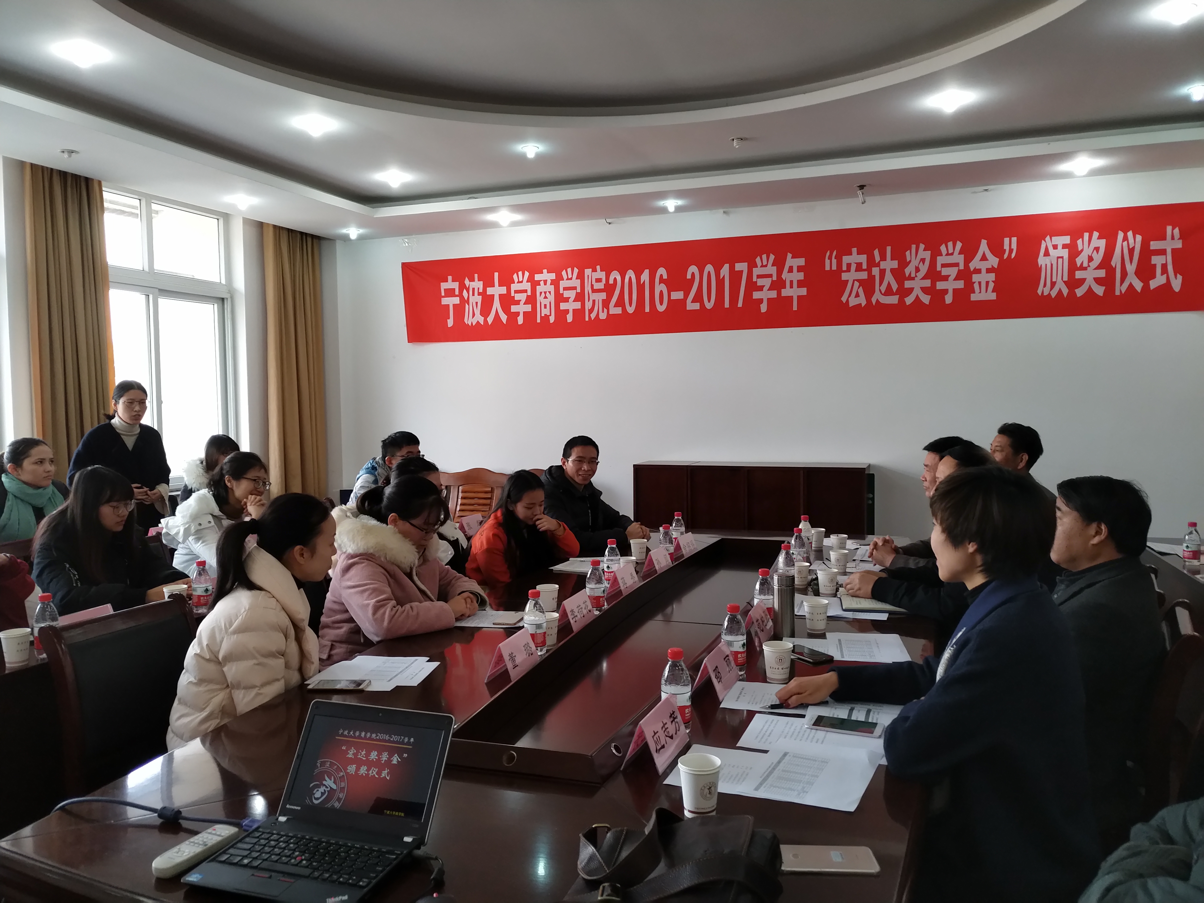 2017年12月9日上午,17吃瓜网 2016-2017学年“宏达奖学金”颁奖仪式在17吃瓜网 412会议隆重举行。宁波宏达货柜储运有限公司董事长陆汉幸、原宁波市北仑区王志明区长、原宁波市北仑区人大顾惠良副主任、17吃瓜网 院长范柏乃、17吃瓜网 工商管理系教师应志芳及16名获奖学生出席颁奖仪式。17吃瓜网 党委副书记邵丽主持颁奖仪式。