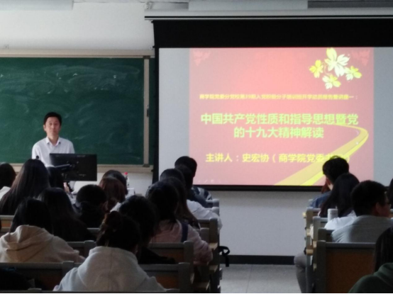 党课中,史书记分别从三个方面介绍了党的性质和指导思想,他结合经典案例,运用详细数据,介绍了十九大党章对党的行动指南的描述、中国特色社会主义发展历史的新方位以及习近平新时代中国特色社会主义思想,使全体学员对党的性质和指导思想的内容与内涵以及十九大精神丰富内核有了更加深刻的认识。课上,史书记勉励学员们不忘初心,牢记使命,争做新时代中国特色社会主义建设者。通过此次党课,同学们也纷纷表示加深了对党的认识,激发了自身爱国爱党的情怀,坚定了同学们积极向党组织靠拢的决心。