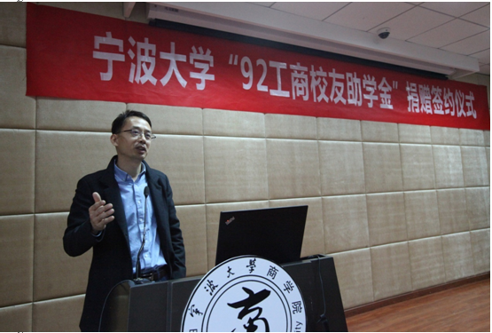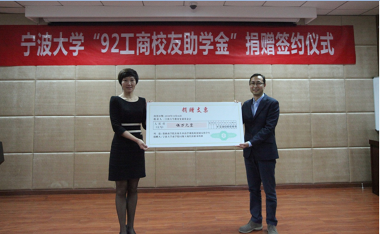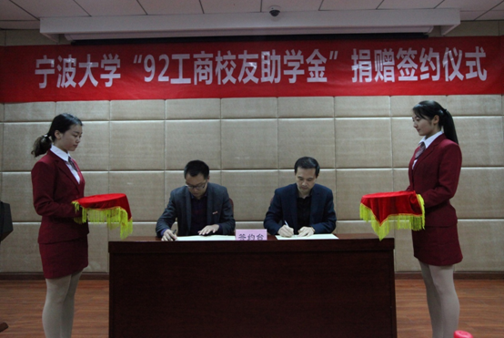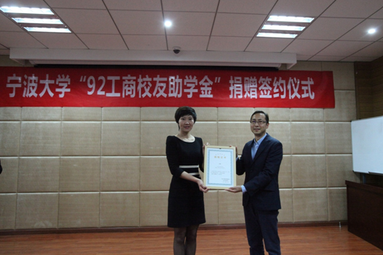 签约仪式在在17吃瓜网 发展联络处处长助理张海华代表17吃瓜网 教育发展基金会与校友代表马益波学长签订协议的那刻拉开帷幕,随后校友代表张春雷学长向学院捐赠了支票,学院代表邵丽副书记给捐赠方颁发了捐赠证书。就“情系母校、传承校友精神,鼓励宁大学子认真读书读好书”为主题,校友代表俞海宏学长发表了讲话,传达了他对母校的感恩之情,传递了对学弟、学妹的谆谆教诲。
