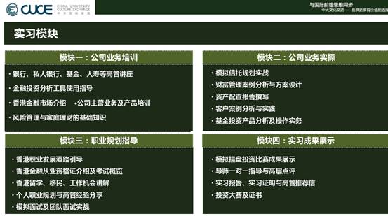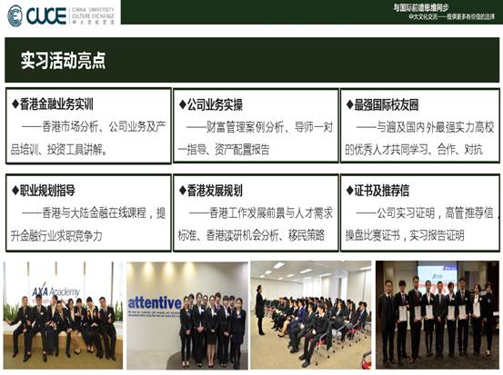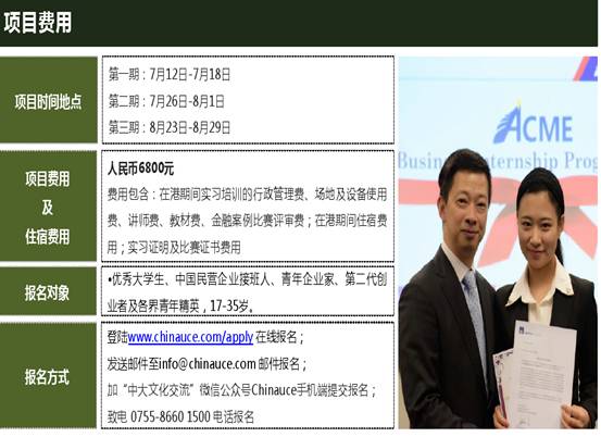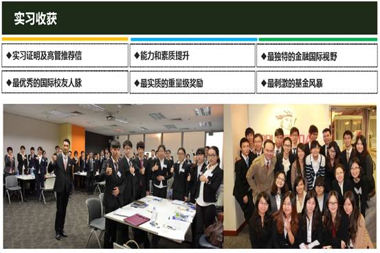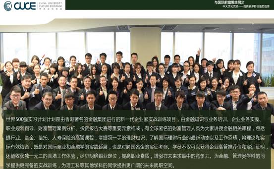 世界500强实习计划计划是由香港著名的金融集团进行的新一代企业家实战训练项目,由金融知识与业务培训、企业业务实操、职业规划指导、财富管理案例分析、模拟操盘训练、投资报告大赛等重要元素构成,有全球著名的财富管理人员为大家讲授金融相关课程,包括银行业、基金、人寿保险的高管课程,掌握第一手的理财知识,了解国际理财行业的最新动态以及工作范畴,将理论和实际有效结合,既是对国际商业和金融学的实践延展,也是对跨国名企的实证考察。学员不仅可以获得企业高管推荐信和实训证明,还能收获独一无二的香港工作体验,尽早明确职业定位,提高职业素质,增强在未来求职中的竞争力。