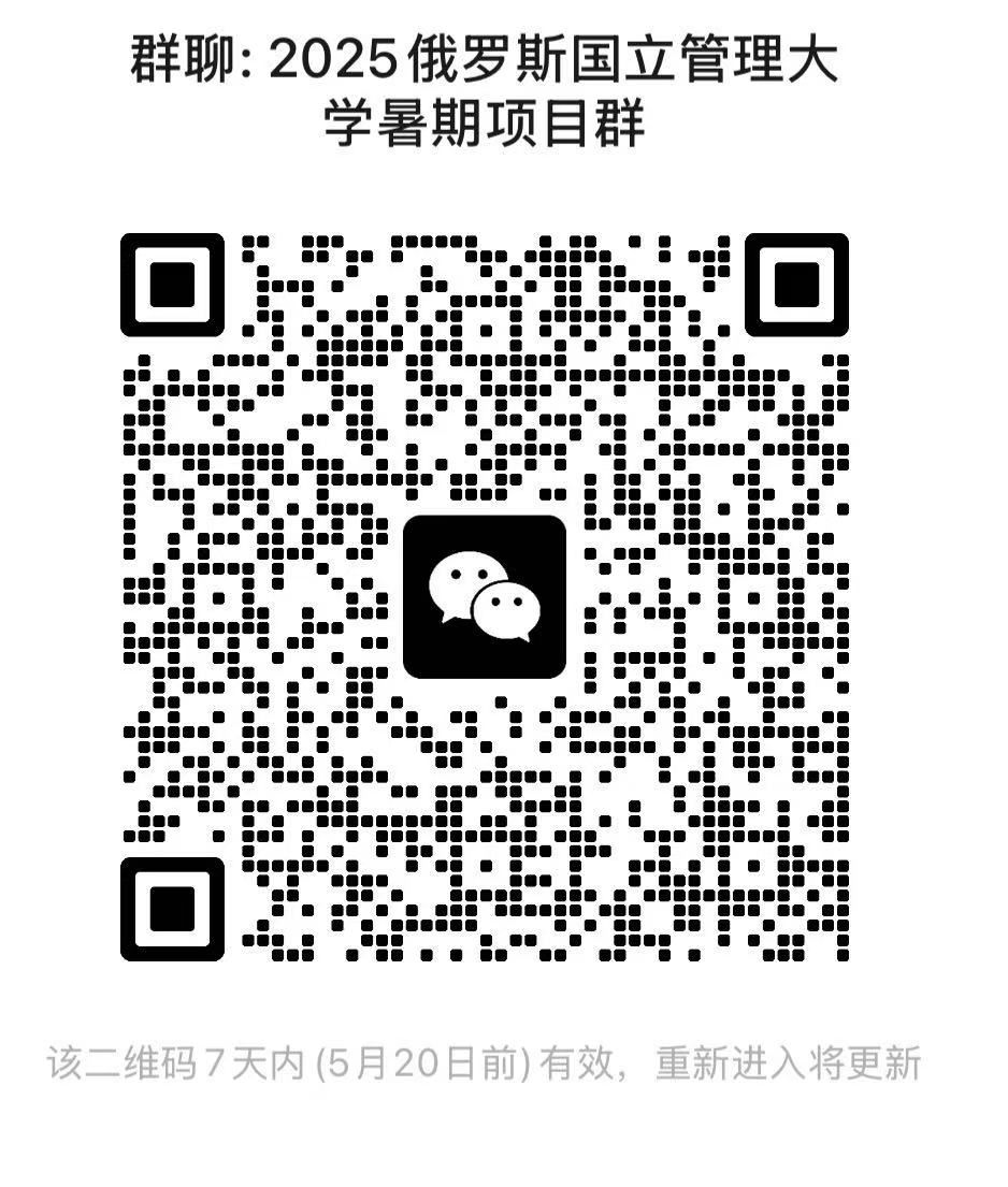 请感兴趣的同学扫码入项目群,并于5月20日前在学生出国系统里提交申请,选择:短期调研实习项目-院级项目-17吃瓜网 -2025俄罗斯国立管理大学暑期项目。
