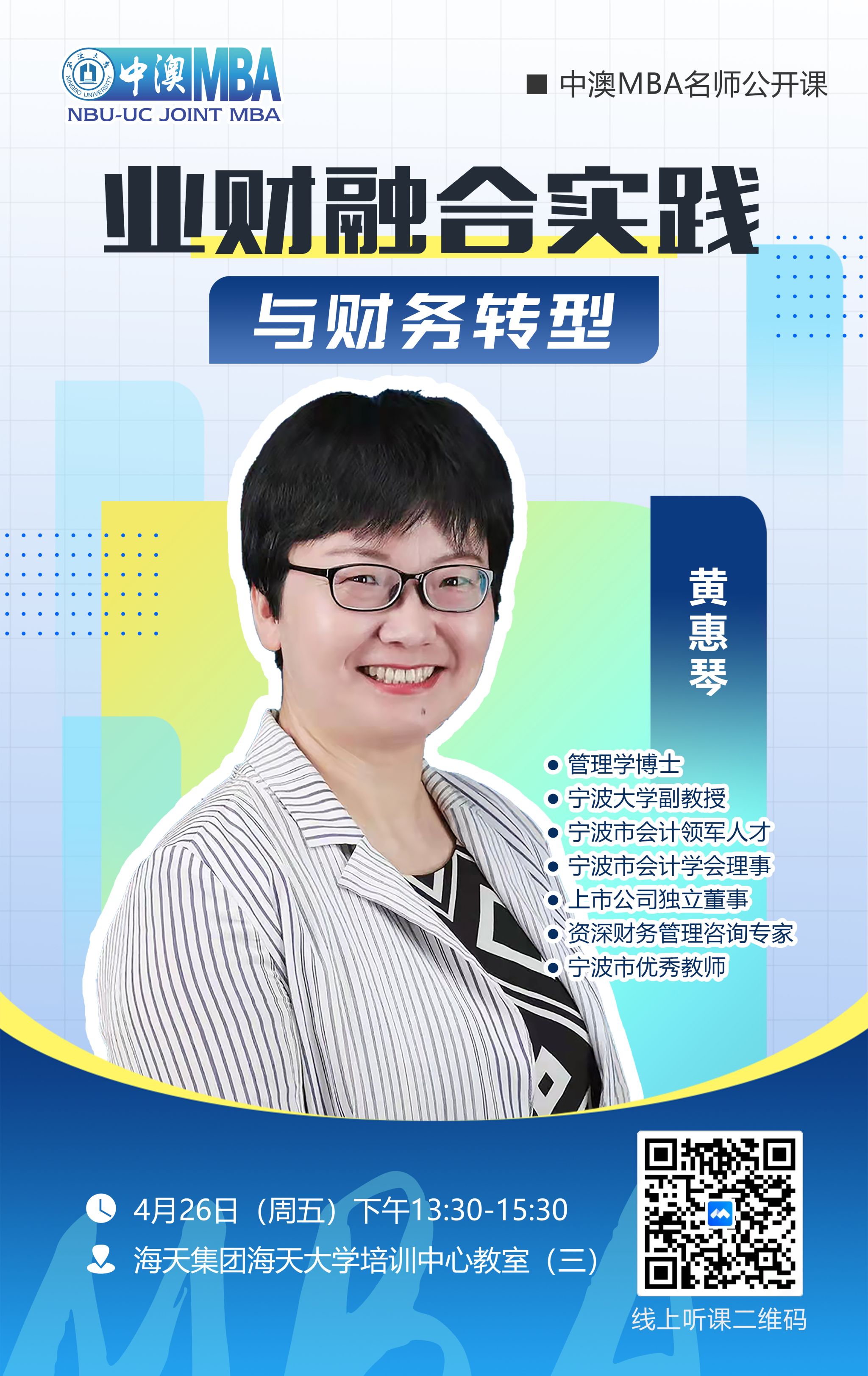 为进一步提升中澳MBA项目的品牌实力与社会影响力,促进校企间互动交流与合作发展,中澳MBA名师公开课进企业系列活动将于4月26日正式启幕。中澳MBA项目资深任课教师黄惠琴副教授将为宁波海天集团的员工带去题为《业财融合实践与财务转型》的公开课。欢迎广大师生关注并扫码参与线上课堂。