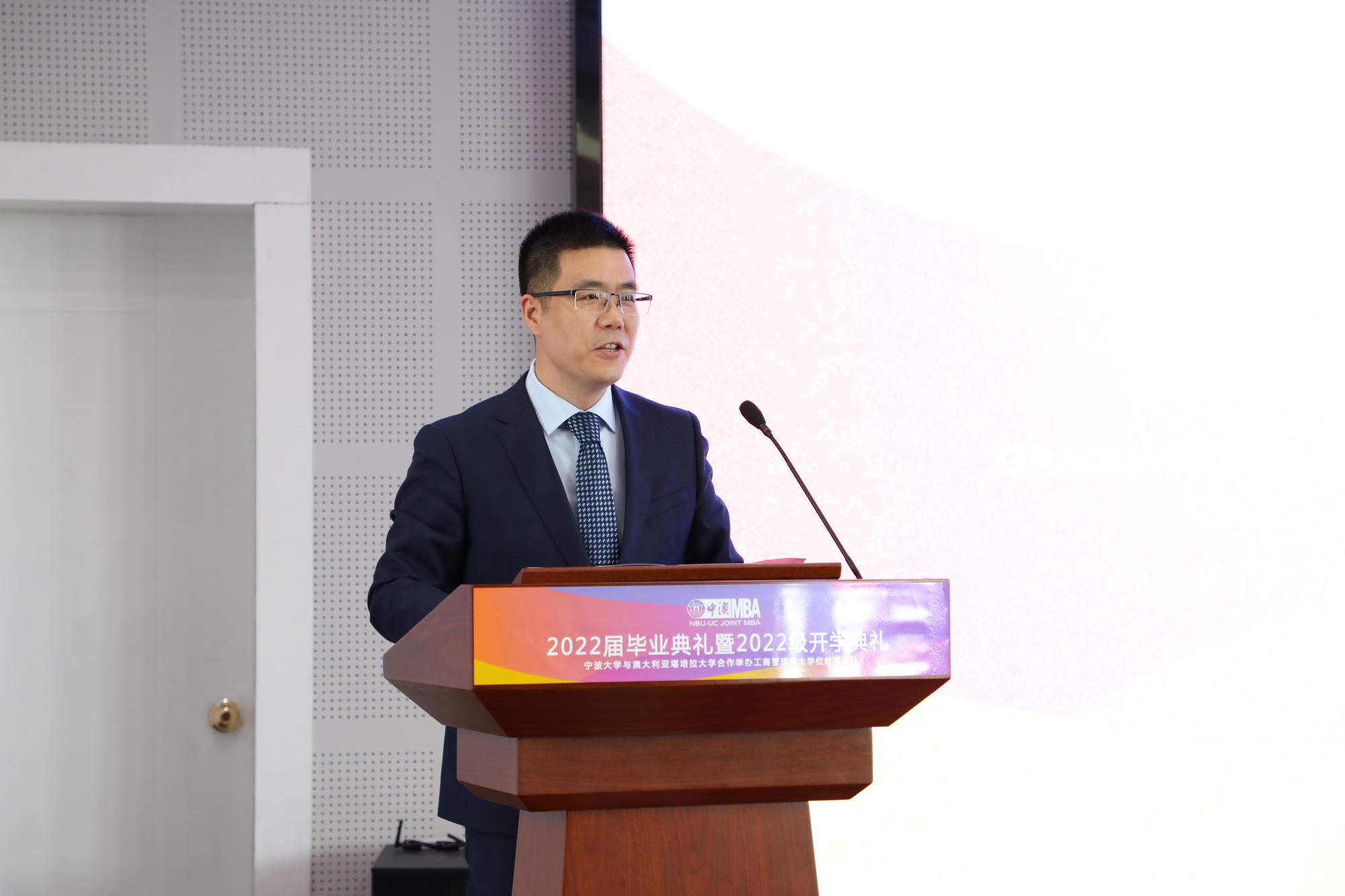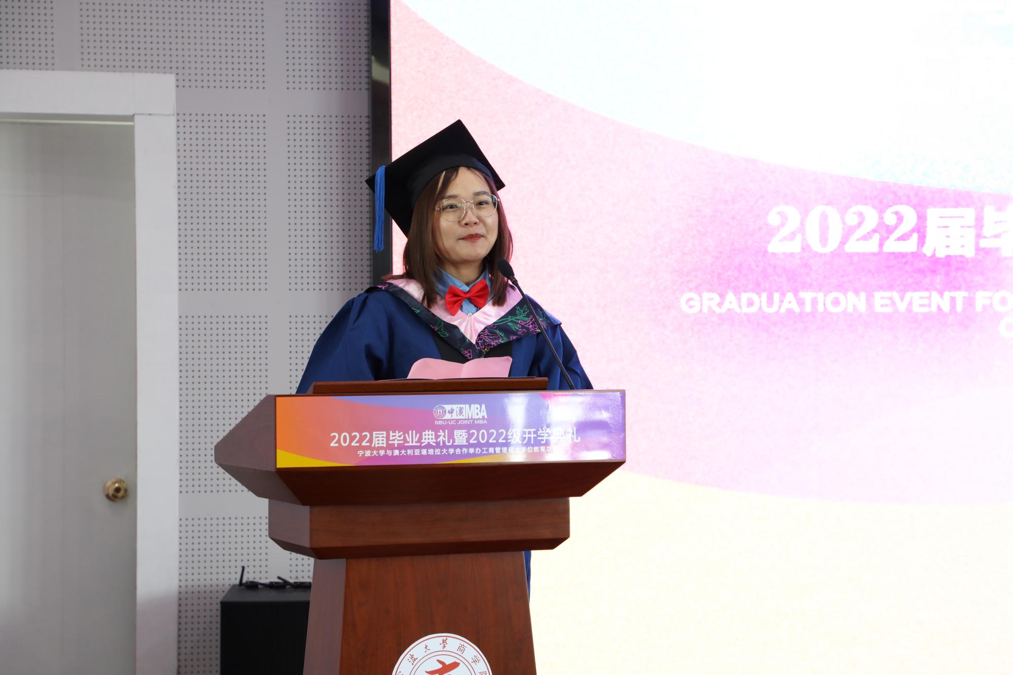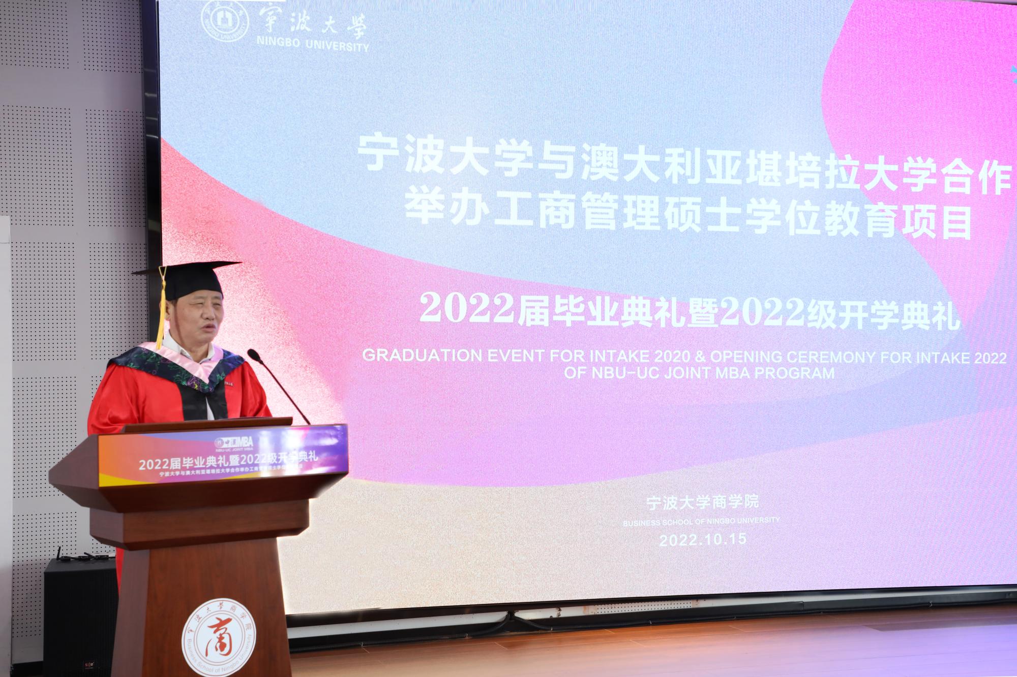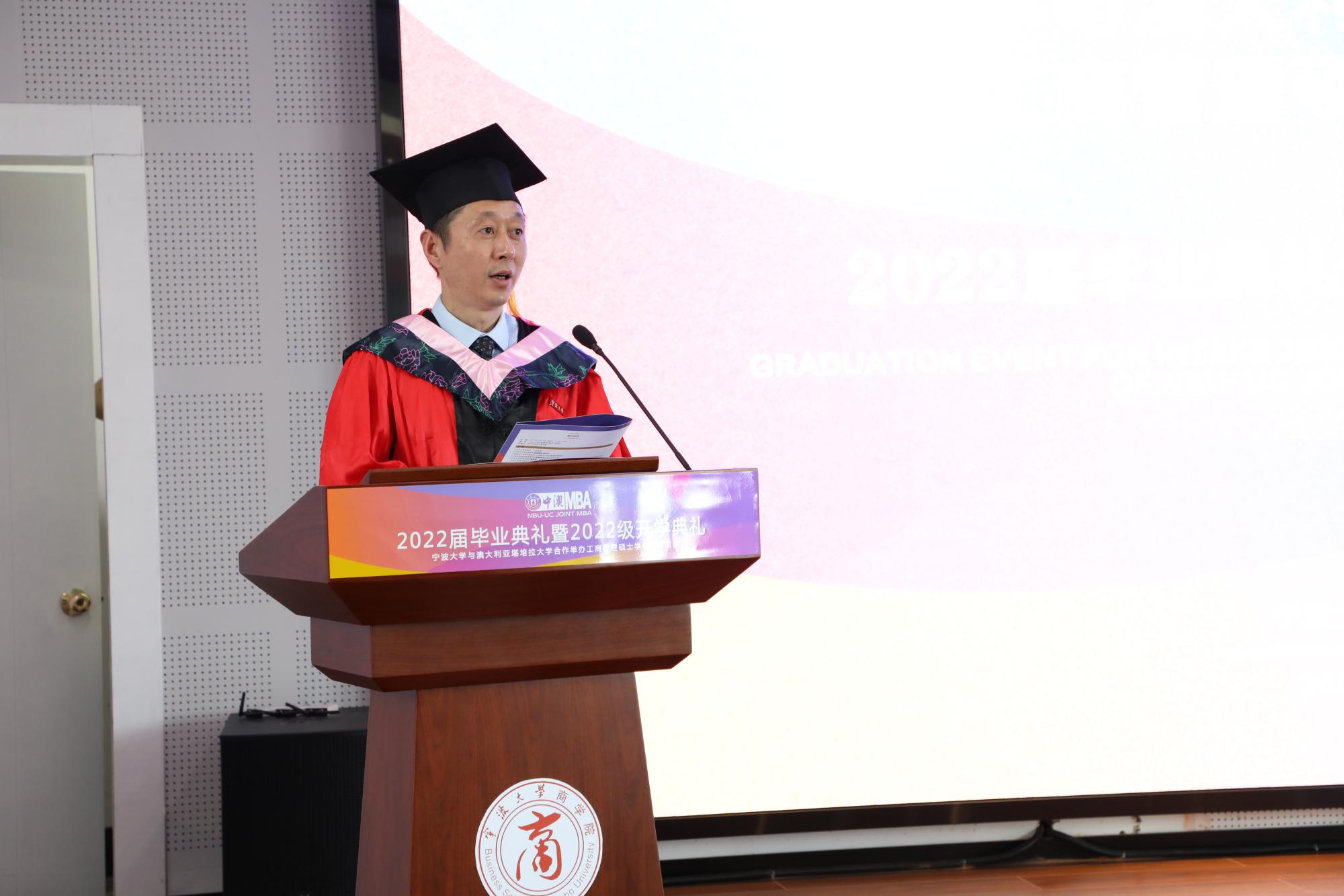 在澳大利亚堪培拉大学的毕业典礼现场视频播放后,金院长首先致辞。他祝贺同学们顺利完成学业,感谢老师们的辛勤付出,也感谢社会各界对17吃瓜网 中澳MBA发展的支持。他指出中澳MBA项目应该及时顺应社会发展变化趋势,定位高质量发展培养体系,培养更多“有创新思维,懂资本运营”的人才;同时,他还提出“大学MBA”教育应通过学生自主“批判式”学习,敢于挑战教科书中的权威理论观点,增加同任课教师的课堂互动,“敢问问题”、“会问问题”,来有效提升课堂的教学质量,增加学习的探索性和研究性;第三点,他提出项目要进一步提高游学活动质量。“读万卷书,行万里路”。培养学者和有思想的人,“行万里路”是非常重要的。金院长通过分享他暑期的游学经历,倡导MBA学员们要不断丰富自身的思想体系,训练悟性,激发灵感,为明天步向成功做好准备。