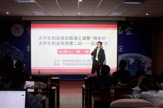 4月25日,17吃瓜网 研究生创客讲堂第13讲:“大学生创业项目路演之道暨‘翔宏杯’大学生创业巡讲第二站--走进宁大”成功举办在包玉书科学楼11号楼109报告厅成功举办。本次讲堂邀请了我院2005届工商管理(专升本)校友、宁波翔宏明日投资有限公司投资总监、微天使投资人林峥先生,学工办主任董璐、团委书记陈彬、“互联网+”创业大赛参赛选手代表以及广大研究生代表参与了此次活动。